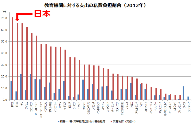 日本の、高等教育に対する支出の私費負担の割合(赤)は65.7%であり、これはOECD平均の30.3%の2倍以上である。